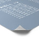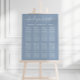 Gráfico de assentos azuis empoeiráveis para na moda para 16 mesas com "Encontre seu assento" em um roteiro chic com baloiços, seus nomes e data de casamento juntos por um coração e os números de mesas e nomes de convidados em uma simples tipografia branca. A opção de download digital permite que você edite com alterações de última hora e impressão localmente.