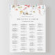Este clássico gráfico alfabético floral colorido é perfeito para um casamento tropical. O design apresenta flores silvestres, rosa, púrpura, amarela, burgundy, marinho e azul, desenhadas à mão, organizadas em lindas formas. Este sinal pode ser usado para organizar seus convidados em ordem alfabética ou por número de tabela. Ele tem espaço suficiente para cerca de 150 convidados de casamento. Deixe espaço para mais (ou menos) clicando no botão personalizar e aumente ou diminua o tamanho da fonte. Personalize este sinal com os nomes da noiva e do noivo e a data.
