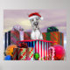 Compartilhe uma Surpresa de Férias com este Merle Great Dane vestindo um chapéu de Papai Noel saindo de uma enorme caixa de presentes. Trabalho de arte de Natal de Danes-R-Us.