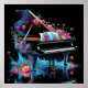 piano de cauda preto maravilhosamente decorado com flores coloridas e efeitos fluentes sobre a água em um fundo escuro, misturando encanto musical e elegância da natureza em harmonia artística.