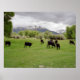 Um rebanho de gado negro pastou a grama verde brilhante nesta adorável fazenda fora de Elko, Nevada. A Montanha Ruby de Nevada está ao fundo e o céu está cheio de nuvens. Esta pintura digital dá um olhar artístico à fotografia original.