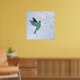 A cute green hummingbird with blue cherry blossoms on a blue floral shimmering background. Elegant nature design.