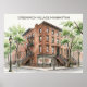 Arte de bairro em aquarela do Greenwich Village apresentando clássicos brownstones, calçadas arborizadas, escadas de ferro fundido e fachadas de tijolos quentes renderizadas em suaves lavagens de vermelhos, marrons e verdes folhosos. Sugestões sutis de vitrines e lampiões antigos evocam o charme boêmio do Village sem incluir pessoas ou placas. A composição destaca o caráter íntimo, histórico e artístico do bairro, capturando suas ruas aconchegantes, energia criativa e identidade atemporal de Manhattan.