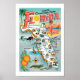A colorful retro, vintage map of the State of Florida featuring attractions, state flower, bird and fruit. We've sized it to 8 x 12 with a white border for easy framing.