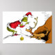 Essa hilária ilustração captura o momento preciso em que o Grinch decide que seu cachorro precisa de uma atualização! O Grinch, vestido com seu traje completo e fofinho de Papai Noel, está amarrando meticulosamente um único galho de rena na cabeça de seu cachorro, Max, usando um pedaço de corda ou fio. O pobre Max parece totalmente resignado ao seu destino como a "rena relutante". Essa ilustração divertida e clássica destaca perfeitamente o planejamento absurdo e travesso por trás do famoso roubo de Natal!