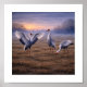 Esta obra de arte retrata um pequeno grupo de grous-de-pescoço-branco reunidos silenciosamente em uma planície aberta de inverno no Japão.
