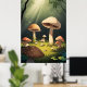 Uma ilustração química mostra um aglomerado de cogumelos em uma floresta coberta pelo sol. O maior cogumelo, com um boné branco pontilhado de manchas marrons, fica alto no centro, seu caule vazando uma longa sombra.