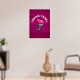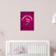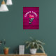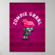 Um poster com uma ilustração fofinha de zombie com cabelo rosa quente e pele verde-morta. Vestir o punk rock temido. Seus braços se estenderam em busca de cérebros. O texto curvo diz: Zombie Grrl. Colocado sobre um fundo que é uma cor magenta profunda com uma aparência granulada.