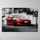 Imagem de ação de um Nissan GTR modificado, deslizando a força através de uma travessia ferroviária, evitando ser atingido por uma locomotiva em alta velocidade. Imagem de efeito de desenho preto e branco/colorido.