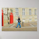 "Danish Royal Life Guarda on Patrol, Copenhagen, Dinamarca", por Catherine Sherman A Guarda Dinamarquesa da Vida Real está passando por um Palácio de Amalienborg em Copenhague, Dinamarca. A guarda veste o tradicional uniforme da Guarda Real Life com um boné azul e carregando uma espingarda no ombro enquanto desempenha as suas funções cerimoniais. As caixas de entrada vermelhas adicionam à tela cerimonial. As Guardas da Royal Life são mais normalmente fotografadas vestindo chapéus altos e pesados de pele de barba, mas esta fotografia foi tirada em um dia de julho, então talvez seja o chapéu de verão. Amalienborg é a residência oficial da família real dinamarquesa. O complexo palácio tem quatro fachadas clássicas idênticas, na verdade quatro palácios, com interior de Rococo, em torno de um pátio octogonal.