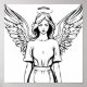 Uma garota de anjo com asas brancas e um halo acima de sua cabeça, um desenho de carvão preto e branco.