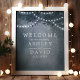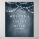 Pôster De Boas Vindas De Casamento Com Luzes De Árvore Floresta Rústica Azul. Lindo sinal de casamento country elegante com um sentimento etéreo sonhador. Luzes de árvore cintilantes penduradas nos topos das árvores. Este design moderno personalizado pode ser facilmente personalizado com seus próprios detalhes.