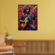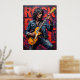 Esta pintura mostra um músico de rock masculino tocando um violão elétrico com foco intenso. O músico, de cabelo longo e escuro, vestido com jaqueta e jeans de denim, é capturado num momento de espetáculo. O fundo é uma mistura texturizada, abstrato, de vermelho, roxo e preto, com a palavra "ROCK" ousadamente visível. O trabalho de arte usa pesada carga técnica, com pinceladas grossas e expressivas que transmitem a energia bruta e a paixão da música rock and roll.