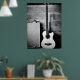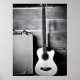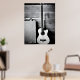 Uma guitarra abandonada pela parede de madeira da sala está esperando seu músico