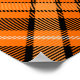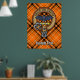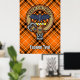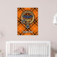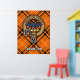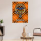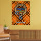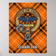 Crachá da crista de Halloween com morcego voador rodeado por uma correia e fivela sobre fundo tartano. Texto personalizado.