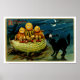 Cartão de saudação Vintage Halloween ilustrado por um gato preto 'assustado' por Three Jack-o-Lantern Pumkins sentado em uma squash.