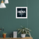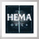 The design features the acronym HEMA crossed by a longsword, surrounded by four symbolic icons inspired by medieval manuscripts. Rendered in cool blue tones with textured details, this artwork creates a powerful and elegant look—perfect for practitioners, enthusiasts, and anyone who loves historical fencing and sword culture.