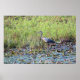 Uma fotografia de um Herão Azul Excelente atravessando um lago. O lago está coberto de lírios de água. A lagoa é confinada por plantas-tronco verdes. Imagem Copyright ©2021 Kimberly J Tilley.