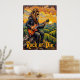 Este trabalho de arte dinâmico retrata um leão, olhando facilmente legal em óculos de sol e uma jaqueta de couro, "raspando" magistralmente um violão elétrico enquanto pregava numa rocha. A cena se desenrola sobre colinas verdes rolantes e árvores distantes sob um vasto e feroz céu por pôr do sol. O espesso e expressivo impacto que cria uma textura tangível, fazer da declaração "Rock or Die", ressoa com a energia bruta do desempenho.