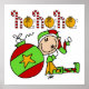 Um design de Natal bonito apresenta um elfo vestido com um boné de meia vermelha e calçados de elfo pontiagudos que descansam contra uma bola de ornamento de árvore e um texto riscado de cana doce lê Ho Ho Ho em T-shirts de férias, canecas, bolsas, camisetas, botões, ímãs, adesivos e muito mais!