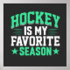 Poster de hóquei com texto verde e branco sobre fundo preto lê Hockey é Minha Estação Favorita!