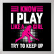 Hockey Play Like a Girl poster mostra uma bobeira jogadora de hóquei feminina e as mensagens que eu sei que toco como uma garota tentando se manter acordada!