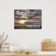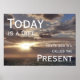 Hoje é um presente, por isso é chamado de presente. Acordar todas as manhãs com uma paisagem inspiradora motivacional de decoração com uma citação de autoajuda. Paisagem vertical cêntrica de um dramático céu ensolarado matinal, com nuvens, e a luz do sol a brilhar através do cobrir de nuvens com um céu laranja e azul primitivo sobre as ondas do oceano. Luz do sol brilhante com raios de luz através da orientação horizontal. Todos os Designs Copyright © 2013 www.CuteComfy.com