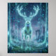 A majestic hologram stag stands proudly within a glowing futuristic forest, formed from transparent light planes, fiber-optic musculature, and radiant branching antlers. Cyan, emerald, and electric blue tones shimmer across its noble silhouette, creating a regal cyber-mythic presence. Crystal trees, luminous roots, drifting mist, and distant geometric ruins build an enchanted technological world around it. This elegant stag design is perfect for modern homes, offices, gaming rooms, and nature lovers seeking bold futuristic wildlife imagery.