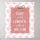 Scrapbook style typography poster with the phrase, "HOME is not COMPLETE without DOG HAIR." Faux ribbon and button on a background that has pink animal paw prints. Designed by Rycky Creations; elements from Pixelscrapper.