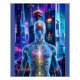 Uma forma humana brilhando se coloca num pano de fundo dos arranha-céus futuristas, com cores vibrantes e pontos de energia iluminando várias partes do corpo. A paisagem urbana de alta tecnologia reflete as luzes de néon, criando uma atmosfera dinâmica e energética. Digital Art Photoshop CS5