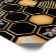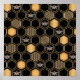 Este design contemporâneo apresenta um padrão geométrico de coloração dourada das colmeias, mamangabas e um fundo preto.