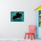 Uma silhueta de cavalo e cavaleiro com um cavaleiro equestre sobre um saltador/caçador que salta sobre uma cerca de metal ruidoso cor de turquesa.