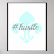 Sky blue fleur de lis garnish with light grey overlay lettering, hashtag "hustle.' Evoking social media memes. White background with bold black border, looks great with or without frame.