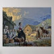 Vintage color art, mostrando jovens meninas em uma colina montanhosa observando sobre vacas e cabras de leite.