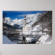 Poster da famosa Rua. Igreja Sebastian na neve apoiada por montanhas alpinistas com uma ponte e um pequeno riacho em Ramsau b. Berchtesgaden, perto da Áustria, no inverno.