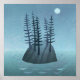 Uma ilha remota no meio do oceano com pinheiros. A lua brilha nesta cena pacífica, e a aventrura acena! Pintura de paisagem original de Nic Squirrell.