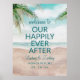 Cena de praia pintada por brisa de ilha, com Ondas de Oceano, praia de Sandy e Palm Trees, com um belo céu azul-lacrimogênio. Com Fontes Modernas De Script De Tipografia. Uma praia tropical de Verão, ou design de casamento de destino - Recepção de casamento personalizada bem-vinda a nossa Feliz Sinal! Veja meu compro para ver a suíte de casamento inteira para este design!