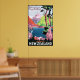 A Ilha do Sul da Nova Zelândia. Uma visão de montanha, um lago e pessoas acampando na costa. Uma cópia colorida restaurada.