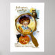 Ilustração de cartão de saudação vintage de Halloween com o texto "Ilumine todas as abóboras e deixe seu brilho estranho, Chame Bruxas e Duendes para manter o Halloween."