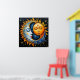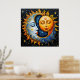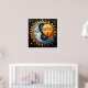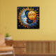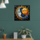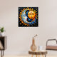 Ilustração de um sol simbólico e lua entrelaçados contra um fundo cósmico e estrelado usando cores vivas e ousadas. Representa dualidade, equilíbrio e harmonia celestial em um estilo artístico.