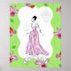 Um vibrante impressão floral destaca uma mulher elegantemente vestida em um vestido lilás de cheio.