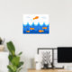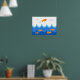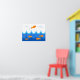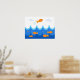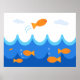 Nesta ilustração fofa e divertida, um peixe laranja voa acima das ondas enquanto outros peixes laranja natação na água abaixo. Decore o quarto de sua criança favorita com este poster divertido, fofo e divertido.