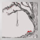 Ilustração do nariz de um enforcador pendurado na árvore com cogumelos vermelhos na base da árvore.