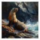 Uma ilustração digital de um leão-do-mar se balançando preguiçosamente na costa rochosa.