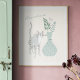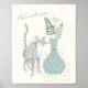 Esta arte de na moda apresenta uma bonito ilustração de um gato cinza parado ao lado de um vaso verde teal cheio de florais e botânicos. Personalize-o com o seu nome na tipografia de script manuscrito. presente de excelente para amantes de gatos.