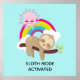 Um poster com uma ilustração com uma preguiça castanha engraçada e feliz pairando em um galho de árvore. Um arco-íris colorido atrás dele junto com um sol rosa pairando sobre a cabeça. Bonita, adorável e moda. Um pouco de humor com o texto dizendo: Modo Leve Ativado. Pode ser alterado ou personalizado com um nome ou outro ditado, se quiser.
