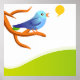 imagem de passarinho nas cores de dois azuis poisando numa arvore e olhando para o sol