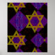 Imagem temática de Hanukkah da SlipperyJoe's estrela de Davi amarela dourada velas azuis com chamas laranjas ideia de presente de arte inspirada em menorá identidade judaica espiritualidade feriado padrão simétrico ousado e retrô em forma de diamante no fundo combina tradição e design vibrante efeito de xadrez roxo e preto celebração religiosa hebraica