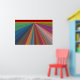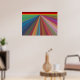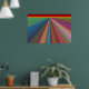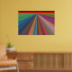 Este poster é uma pintura digital de uma paisagem de abstrato, composta por linhas angulares quase como estradas que levam a um horizonte vermelho e dourado. As linhas se estreitam e convergem no horizonte distante, dando uma impressão de viagem. Estão em todas as cores do arco-íris, incluindo vermelho, laranja, verde, azul, roxo, rosa e ouro. A poster faria uma declaração de cores forte, mas harmoniosa em qualquer sala.