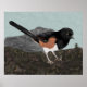 Poster impressão com a minha imagem original de um towhe oriental coçando no chão entre agulhas de abeto e galhos caídos. A ave aquosa é, na sua maioria, negra, com um peito branco e lados cor de ferrugem. Atrás dela está uma pedra grande contra um fundo verde-claro.